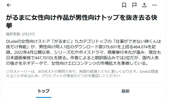 ★がるまに女性向け作品が男性向けトップを抜き去る快挙