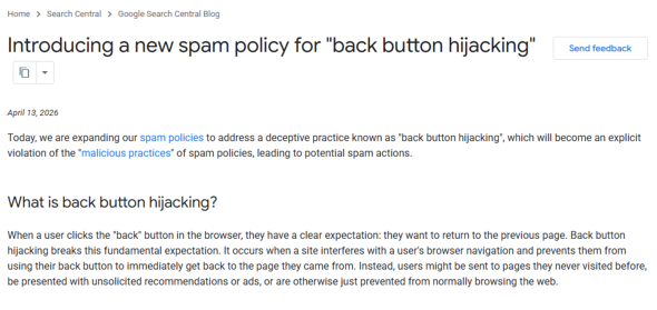 ★「ブラウザの戻るボタン→広告表示」がスパム扱いに Google、6月にポリシー変更 違反で検索冷遇も